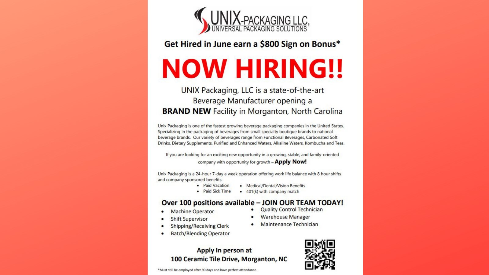 Westernpiedmont Ncworks On Twitter Unix Packaging A State Of The Art Beverage Manufacturer Opening A New Facility In Morganton Nc Is Hiringnow Get Hired In June And Earn A 800 Sign On Bonus Apply In Person Today